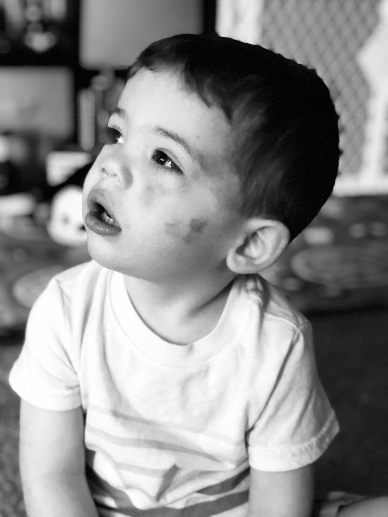 When you see his birthmark, it begins on his left cheek, wrapping up along his temple, eyebrow, scalp, ear and down the back of his neck. We were told that sometimes newborns have “storkbites” and it should disappear by 6-12 months of age. But as G began to grow, so did this birthmark.