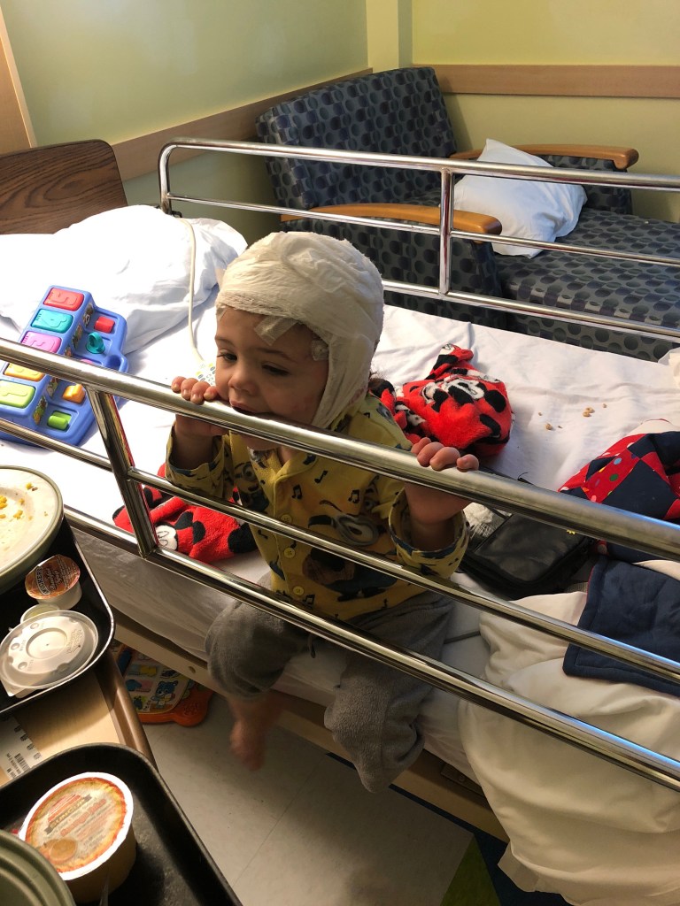 25 gold plated electrodes were super glued to Greyson’s head. My boy’s beautiful curls were brushed out and smothered in super glue and wires. He never lets me brush his hair, so you can imagine how great it was for him to lay on a table and have someone mess with his head for 30 minutes. Greyson was a mess. He began to scream and cry so much, that he eventually cried himself into a comatose state. Through our journey this far, we have become accustomed to G screaming and fighting us at appointments and procedures, but I had never seen him fight this hard. Once the tech completed hooking up the EEG and wrapping Greysons head like a mummy, we were on our way to the pediatric wing.
