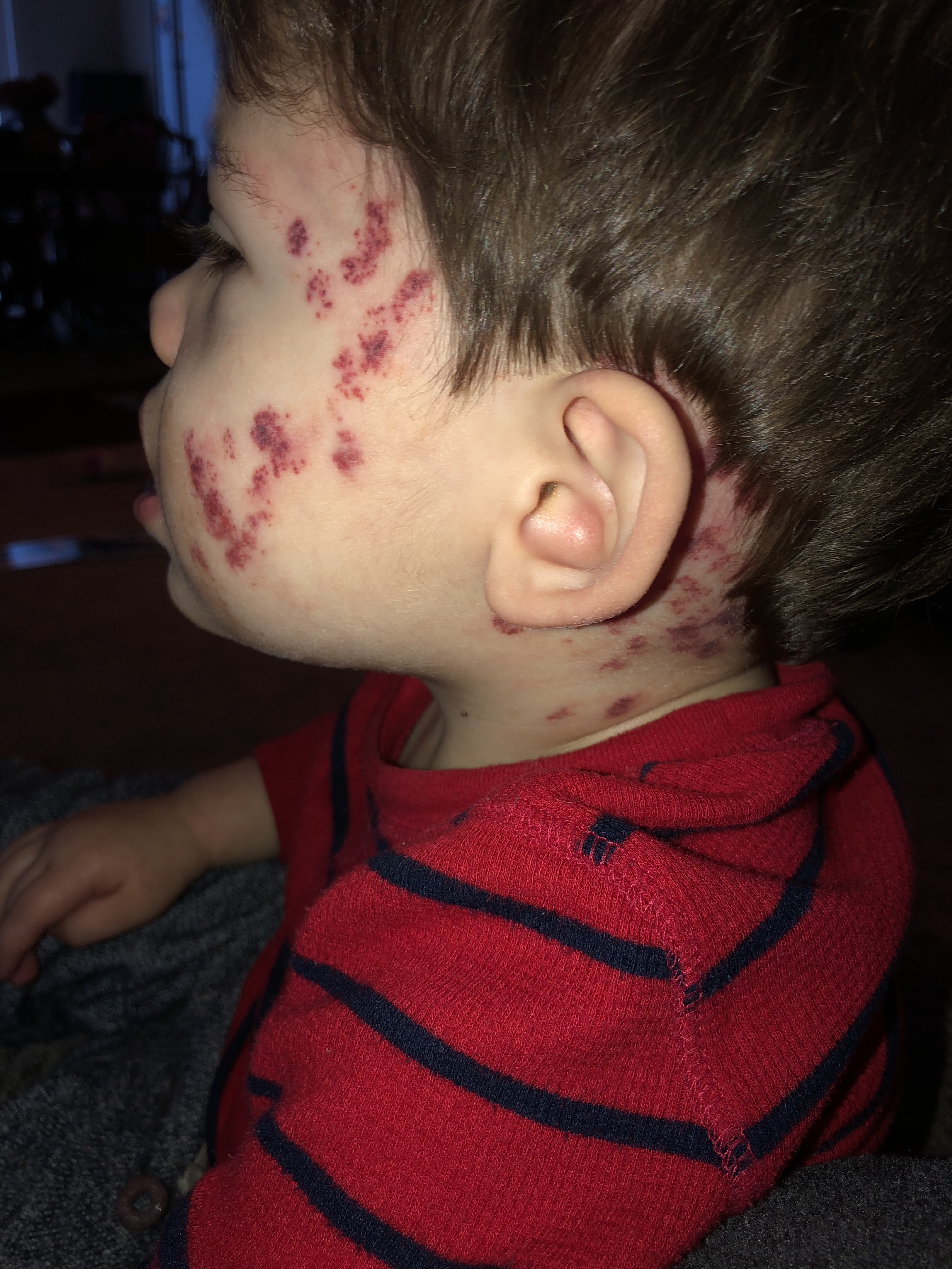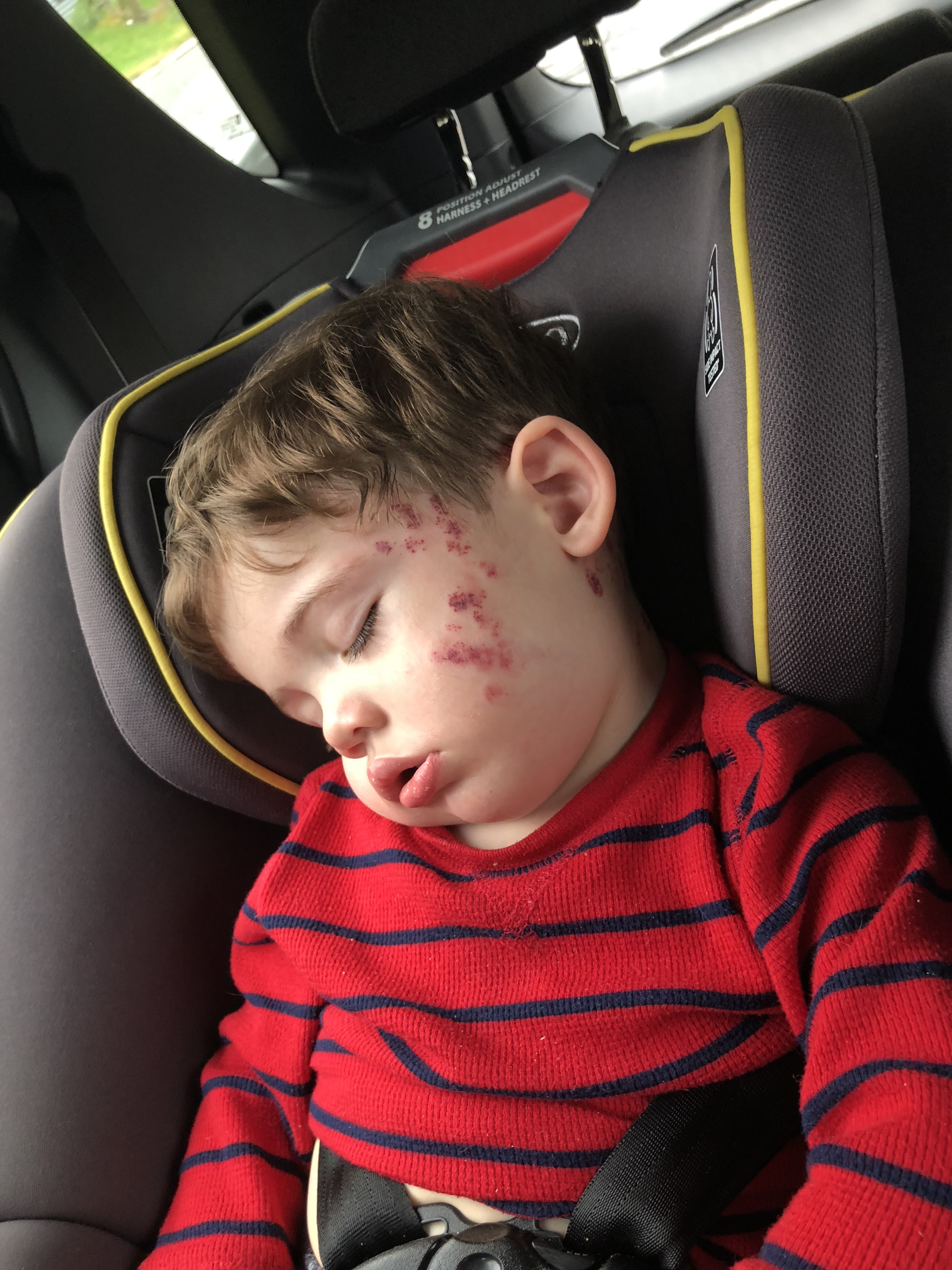 We checked in and they immediately took Greyson back. Roslynn and I used the restroom and as soon as we finished, Greyson was done. I could hear him coming down the hallway, screaming and crying as Derek carried him over his shoulder. At the time I was only focusing on checking out and getting back on the road, so I didn’t notice the bruising on G’s face until we got out of the parking garage.