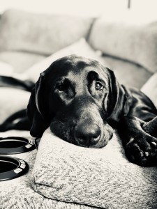 I take steam cleaning very seriously, so I was concentrating on making sure I was getting every spot of the rug. Roslynn was on the couch watching The Phantom of the Opera: Live at Royal Albert Hall for the 500th time and Derek was still in the kitchen, starting pancakes for the kids. When I run the vacuum or steam cleaner, Greyson is typically running around and stimming on the sounds of the machine, but this time he wasn’t. I looked around and noticed Duke (the dog we got to train as a service dog but then definitely was too hyper for that) was laying on the dining room floor nudging Greyson with his nose.