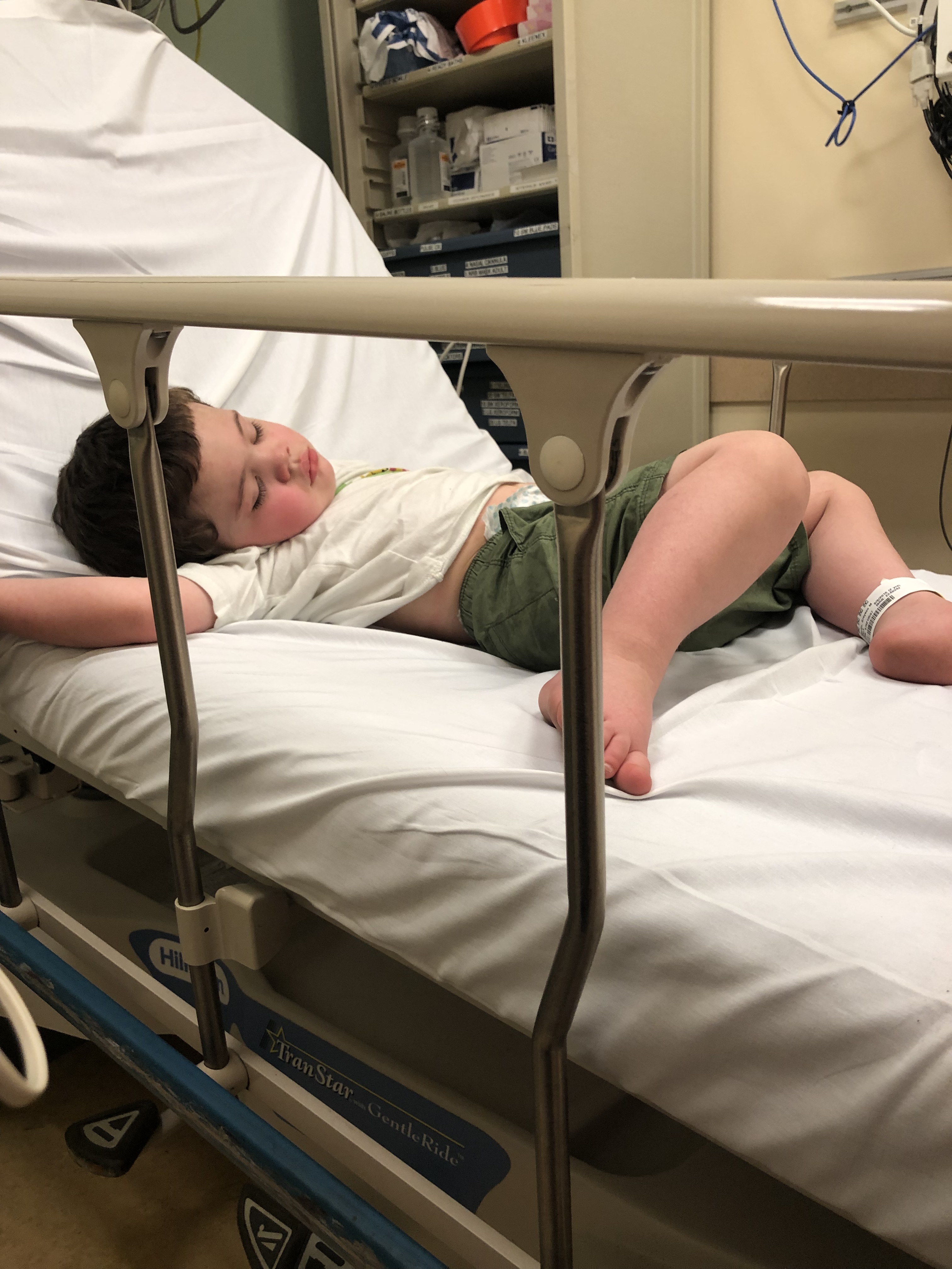 Once we were back in the room, another staff member came in to begin registration for him. They confirmed his information was the same (since we were there just two weeks prior), and got him set up with an identification bracelet and ordered labs to be drawn. If you have ever been to an emergency room, you know that things do not move very quickly. In the midst of waiting for the phlebotomist to come up and draw his blood, Greyson began to get very anxious and angry that he was confined to a small room. He quickly became aggressive: hitting, pulling hair, smacking, pinching, biting and head butting Derek and I any time he was redirected or picked up. He threw a giant tantrum, which wiped him out. He fell asleep almost at the same time that the lab techs came in to draw blood.