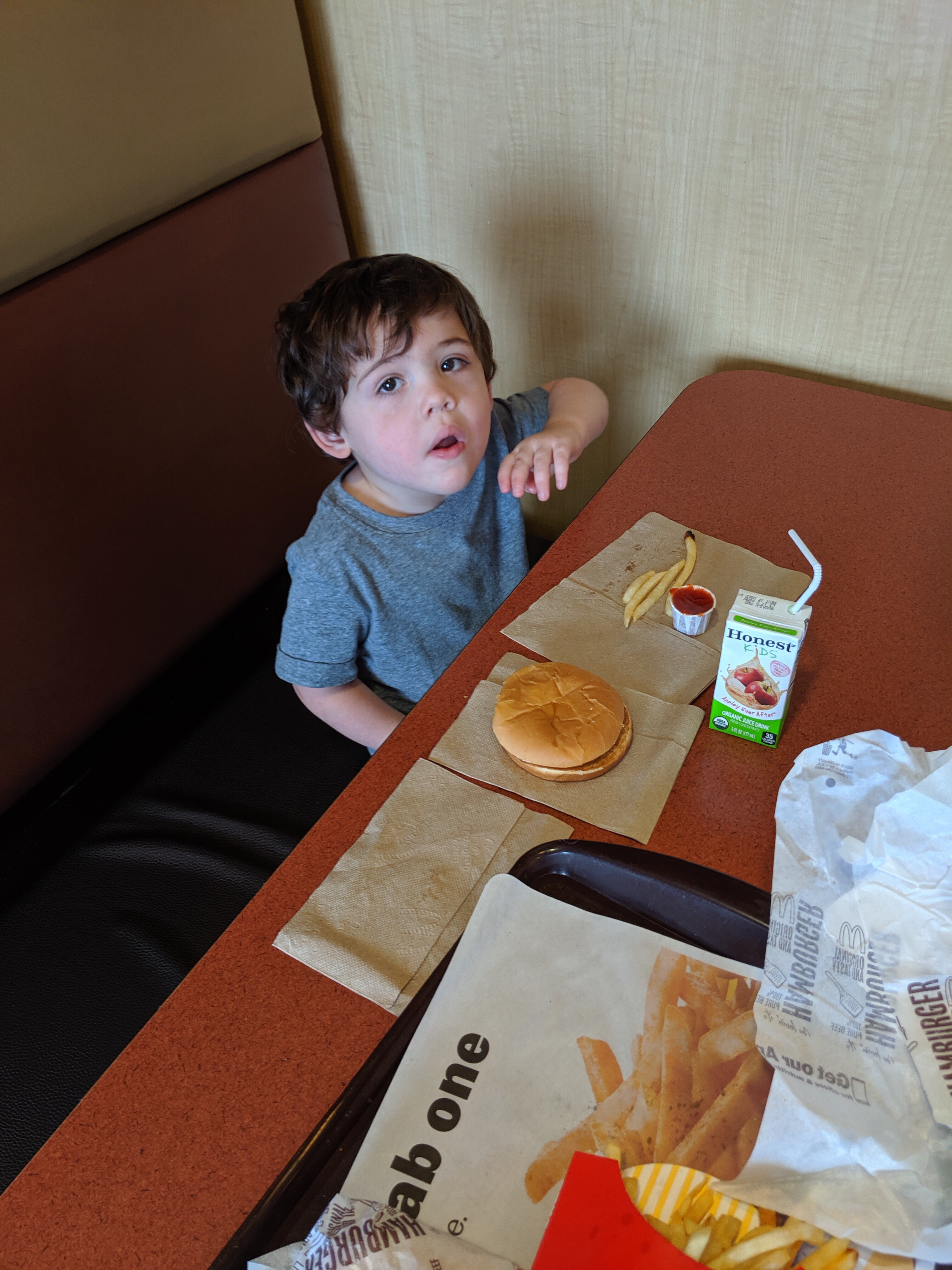 Waiting to go in the school!Because he did so well (and I think Pappy really missed him), he had a lunch date with Rick after school at McDonalds. He did great! Probably the 2nd or 3rd time that he’s ever been at a sit-down place for food. Derek and I are hoping that the structured setting of the school will help G become more compliant. At least compliant enough to take him out to do things in public.