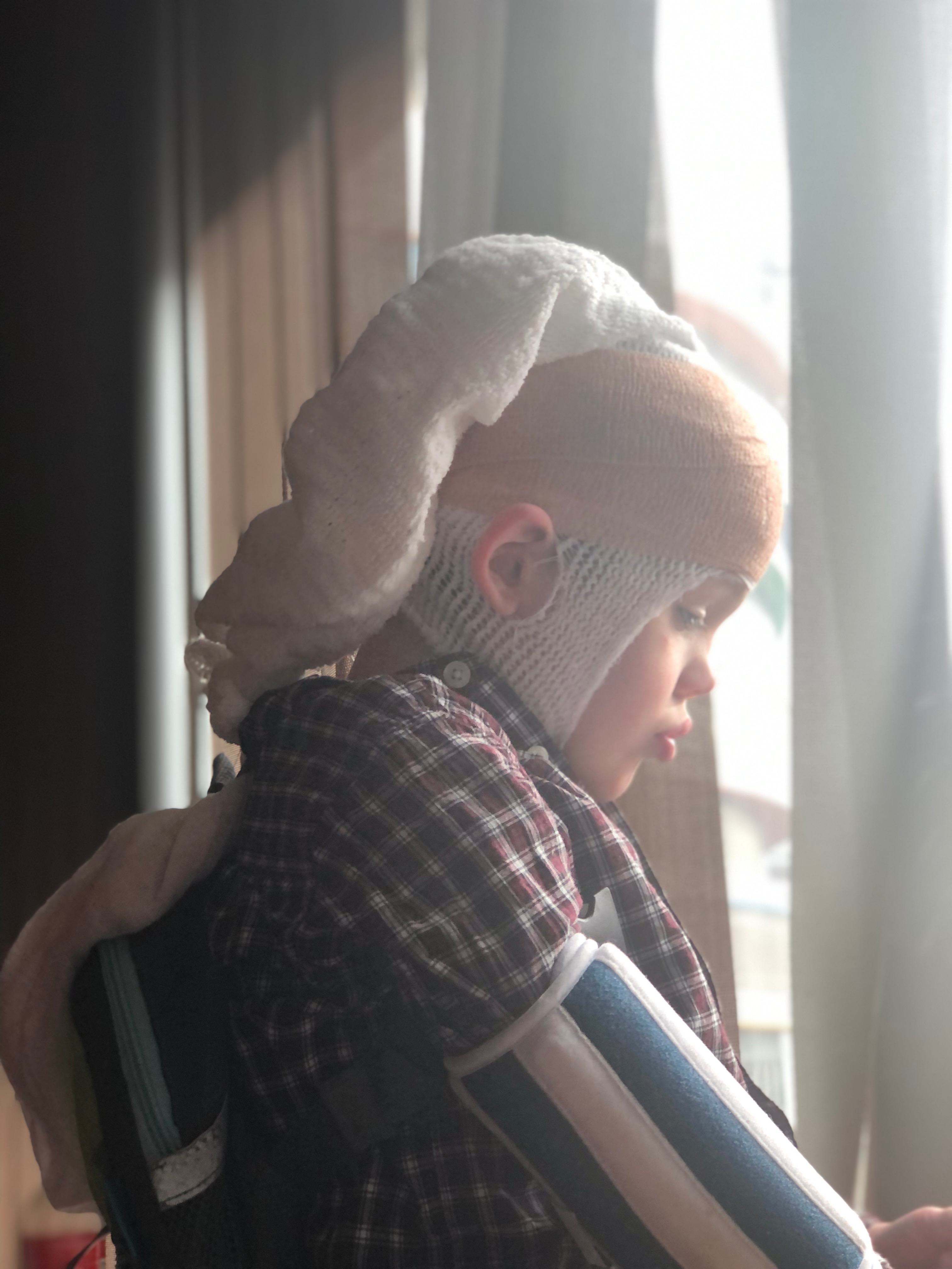 The most difficult part of an EEG for Greyson is when the techs apply the glue/electrodes onto his head. I tried to prepare him for a less difficult application, but cutting his hair the night before the admission, but due to his uncooperation, I ended up only cutting 3/4 of his hair. I knew that the glue was going to be harder to come out of his longer hair, so I attempted to be proactive- unfortunately it ended up just being a hot mess. I had prepped the admission team in advance and told them that Greyson was most likely going to need a papoose and lots of distractions to get the electrodes on well. The team sent childlife in to play and bring toys in, to try and keep him distracted from the glue/hair dryer they use to apply the electrodes. Once he suffered through the stench of waxy glue being slopped into his hair, his head was wrapped several times so he couldn’t take the wires off. Fortunately the final product made Greyson look a lot like Johannes Vermeer’s Girl With the Pearl Earring, (See Below).