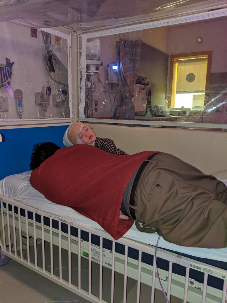 My father-in-law went along with Derek to the hospital for the EEG, so I could stay home to work and keep Roslynn’s routine as normal as possible. The first night, nobody really slept at the hospital. They stuck Greyson in a giant crib-like bed, surrounded by plexiglass and padding, in case he was to have a seizure while he was asleep. Unfortunately, this meant that only Greyson could sleep in it. Greyson will not sleep unless someone is holding him or snuggling with him, so the first night was a lot of up and down, tossing and turning and whining. The second day, the doctors informed Derek that they didn’t see what they wanted to see, so they asked them to stay another night. Greyson was already fed up, but we really wanted to catch a Grand mal on EEG, so he reluctantly agreed. By the evening of the second day, Derek, Rick and Greyson were all done. Exhaustion and frustration had kicked in and by 9 pm, Derek was in a bigger crib-like bed with Greyson, calling it a night.